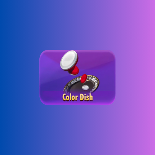 - Simbol-simbol khas: piring warna-warni (merah, biru, hijau, kuning, ungu), dadu, chip emas, dan logo “Color Dish”.